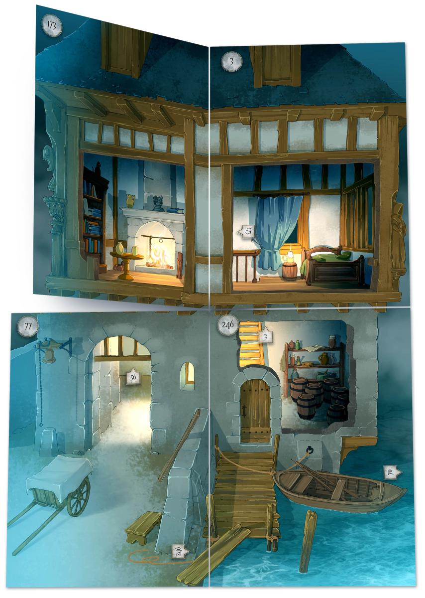 Dans Brumes nous avions fait le choix d’explorer un seul et unique donjon, ici vous pourrez explorer de multiples endroits, un peu comme dans un monde ouvert. Nous vous avons fait voir le donjon, l’auberge avec les 4 fiches qui se posent côte à côte, et voici la maison, tout en hauteur