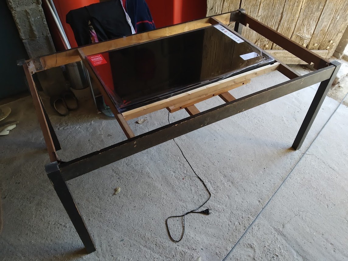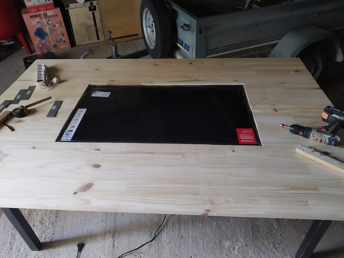 Magasin de bricolage ( brico dépôt) c'est ce qui m'a coûté le plus cher vu que j'ai payé ni la table si la tv. Environ 100 euros mais parce que je voulais un plexi 8mm qui ne se raye pas trop et pour rendre ma table aspect bois brut le plus étanche possible ( on déguste de bons vins pendant nos parties et ... ça tache) si tu te contente de couvrir juste la zone de l'écran ça doit être beaucoup moins cher. J'avais pensé à un verre renforcé mais le prix etait un poil plus cher, on verra dans quelques années si il y a trop de rayures sur l'écran. J'ai aussi intégré une prise hdmi femelle dans le montant pour connecter l'ordi facilement à la tv sans voir à se baisser sous la table ou avoir des fils qui pendent ainsi qu'une multiprise dans les montants pour n'avoir qu'un fil à brancher et éviter trop de câbles. Le tout pour une poignée d'euros.