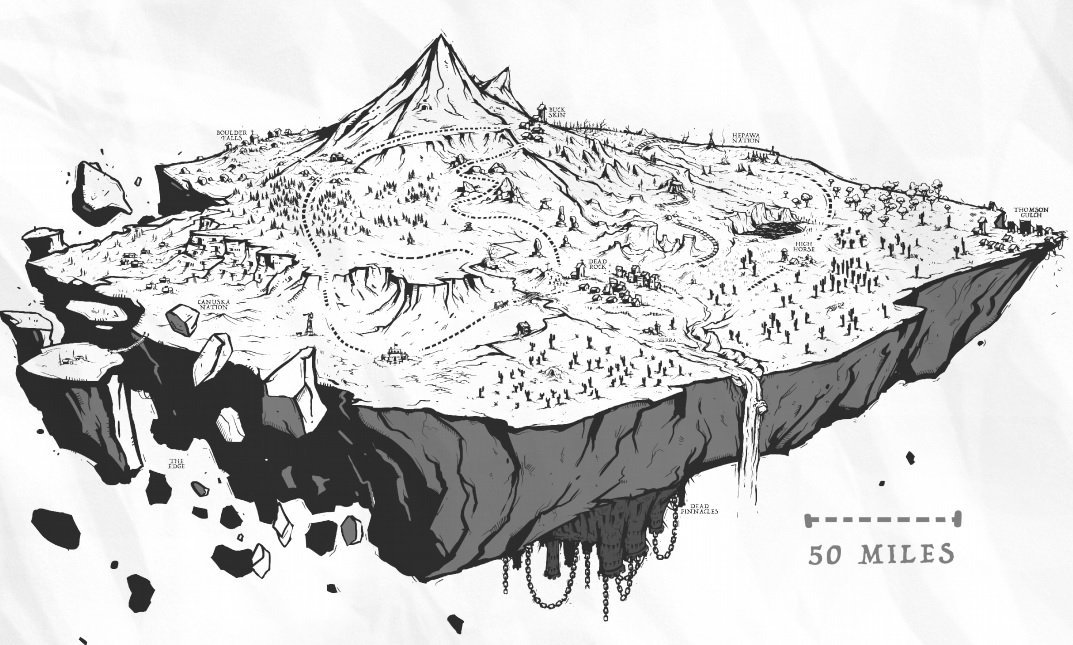 Quelle est ton illustration favorite ? J’ai cité Alfheim à la question précédente, mais mon illustration favorite reste la carte de Ghost Mountain. En une seule image, l’auteur parvient à évoquer tous les classiques du western ET y ajouter ses propres twists marquants. Ça sent le duel au crépuscule et les cavalcades mortelles, les parties de carte à gros enjeux dans un saloon enfumé et les mystères de l’ouest… Que demander de plus ?