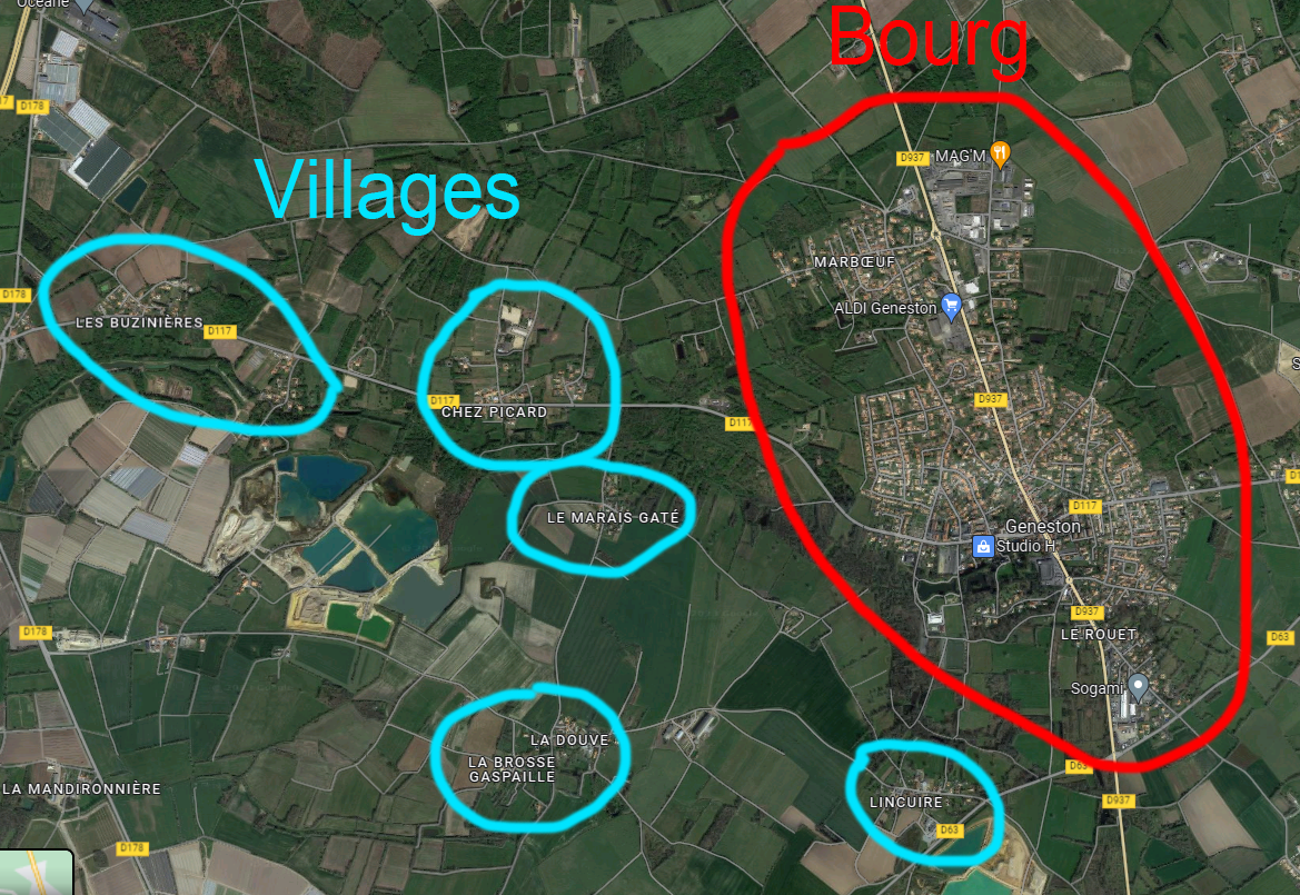 Ensuite j'ai déménagé à Nantes et j'ai découvert qu'ici, un "bourg" est la zone urbanisée principale d'une commune, là où un "village" est un lieu-dit habité situé sur le territoire d'une commune, mais séparé du bourg (et plus petit que ce dernier). Autour de Nantes il y a beaucoup de communes qui disposent de tels "villages" physiquement séparés et éloignes du "bourg" (le centre de la commune auxquels ils appartiennent), alors que je n'avais jamais vu ça en Moselle.