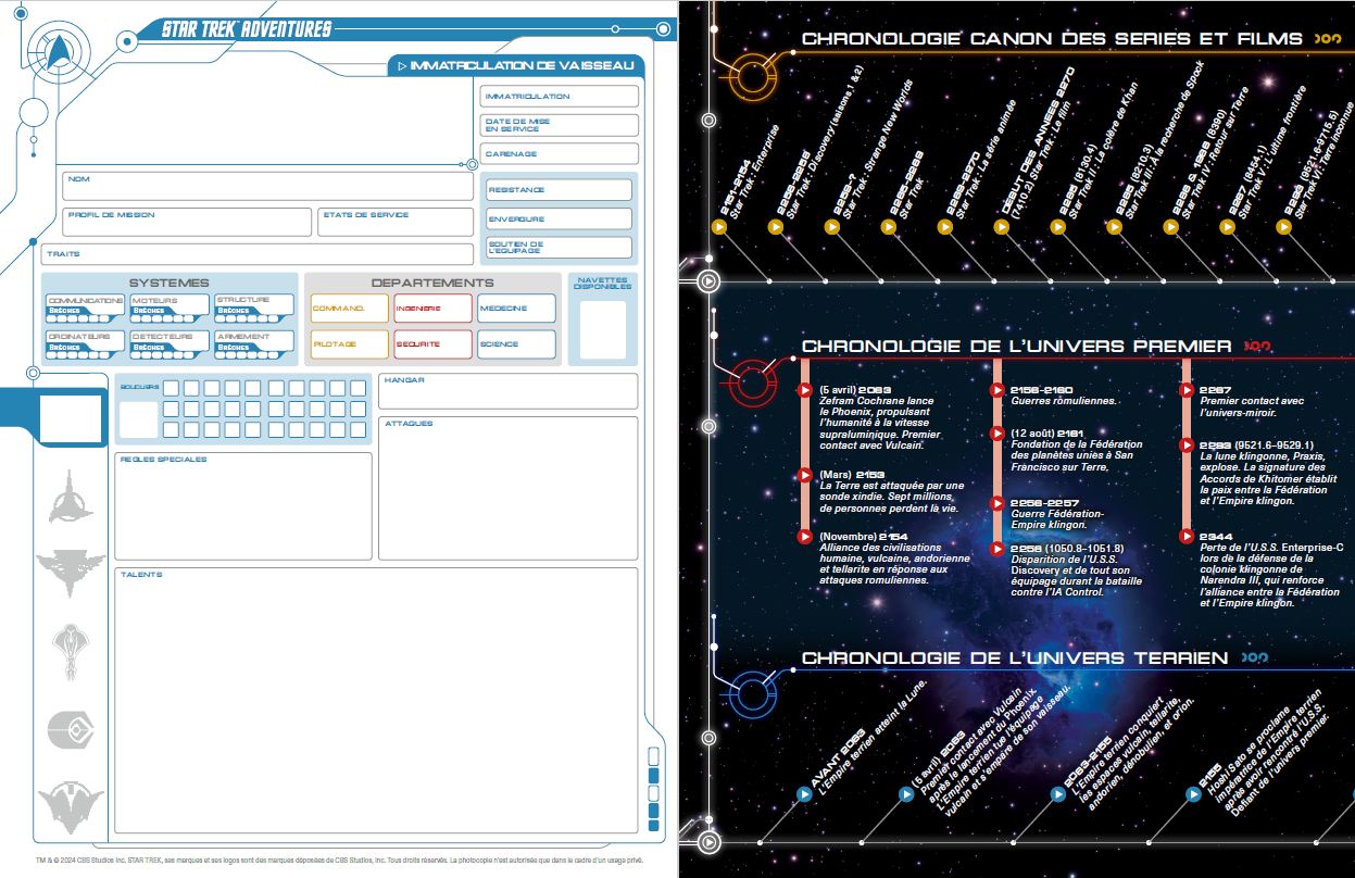 Le Kit de jeu — Un écran à quatre volets illustré par Paolo Puggioni, accompagné d’un livret de 40 pages, de 17 plans de vaisseaux, de cartes de référence et d’une grande affiche recto verso. Tout le matériel indispensable pour vos missions à bord de Starfleet.