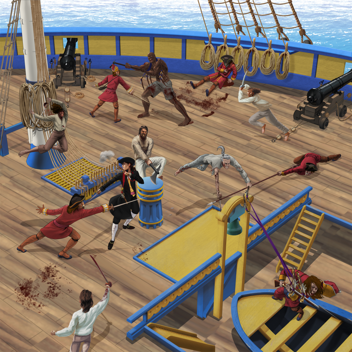 - Le bandana du troisième personnage à partir de la gauche vient d'une représentation typique du XIXème (qu'on retrouve chez Pyle, mais qui n'existait pas au XVIIIème. Idem pour la grosse boucle d'oreille du 4ème personnage