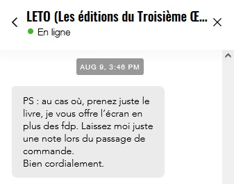 Je n'ai jamais eu aucun problème avec Leto, ils m'ont même renvoyé un bouquin suite à un pledge alors que de mon point de vue ça n'était pas justifié.