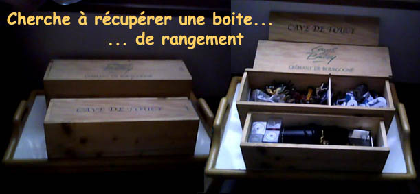 Dans mes pérégrinations pour faire des animations de jeu de rôles, j'ai fini par adopter ces boites en bois pour ranger une partie de mon bazar. Et oui ! Ce sont des boites de présentation de bouteilles de vins ! Je fais donc indirectement de la pub pour les "Caves de Bailly" (Crémant de bourgognes) et la "cave de toucy". Et j'y range : figurines, pions stand-up, dès de toute sorte, billes-plates... Sauf qu'il m'en manquerait encore au moins UNE. Si vous avez ce genre de choses qui traîne chez vous (et que vous passez par Auxerre), je veux bien vous en débarrasser. Ce serait gracieux, mais ça serait quand même un beau geste de recyclage et d'entraide.
