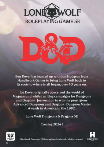 "La surprise du jour, cette page publicitaire provenant d'un catalogue de Holmgard Press: le jeu de rôle de LS sera de retour en version D&D 5e!