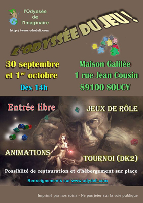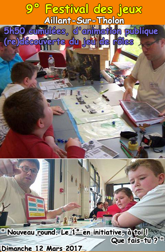 Prochaine occasion de découvrir le jeu de rôles : le festival des jeux d'Aillant-sur-tholon, le 12 Mars. Il y aura des tonnes de jeux de sociétés, de jeux d'adresse... et ma table. Alors n'hésitez pas à y envoyer vos amis, votre famille (etc), qui souhaiteraient faire ses premiers pas, armé d'un d20.
