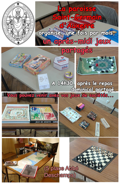 La prochaine après-midi jeux partagés paroissiale n'aura finalement pas lieu le dimanche 30 Avril, mais le dimanche 28 mai. Qu'on ce le dise !
