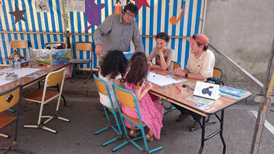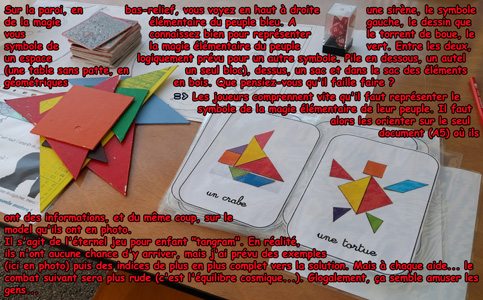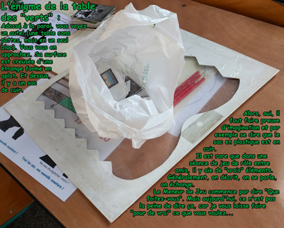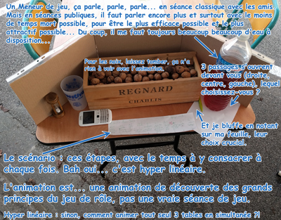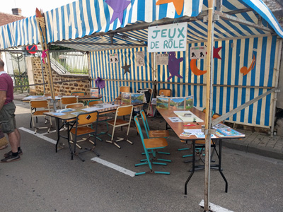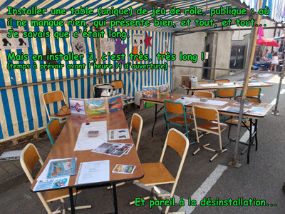Animation découverte du jeu de rôles pour ultra grand publique, dans un cadre ultra pas lié aux jeux. Pour ce faire, je vais animer 3 tables en simultanées. Les 3 tables jouerons dans la même grande aventure. Les feuilles de PJ seront de simples cartons (comme à Loup-Garou de Thierselieu). L'aventure, d'environ 1h45, tournera en boucle et les joueurs pourrons entrer et sortir de la boucle comme bon leur semblera. Un assistant accostera les passants pour leur proposer d'entrer dans le jeu et leur montrer le B.A.BA. des règles...