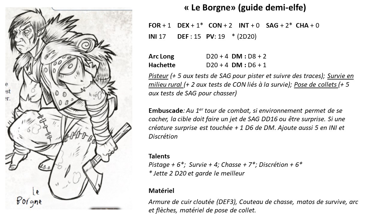 Voici le genre de fiche de PNJs que je créé ; je les donne ensuite aux joueur.euse.s et c'est plus moi que les gères (je fais pas cela pour tous les PNJs of course)