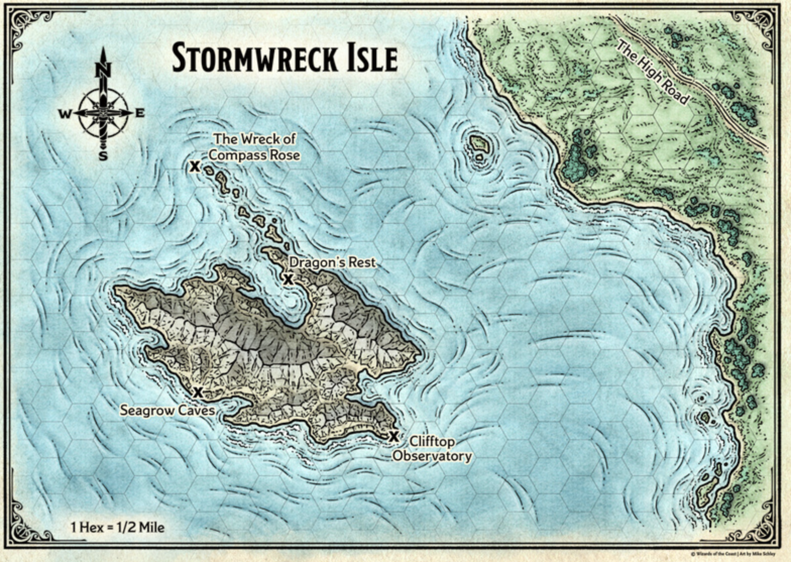 Stormwreck Isle was located in the Sea of Swords about 3.5 miles (5.6 kilometers) from the coast of Faerûn near the High Road.[5] It lay south of Neverwinter,[6] and was very close to that city.[7] It was only about 5 miles (8 kilometers) wide.[5]