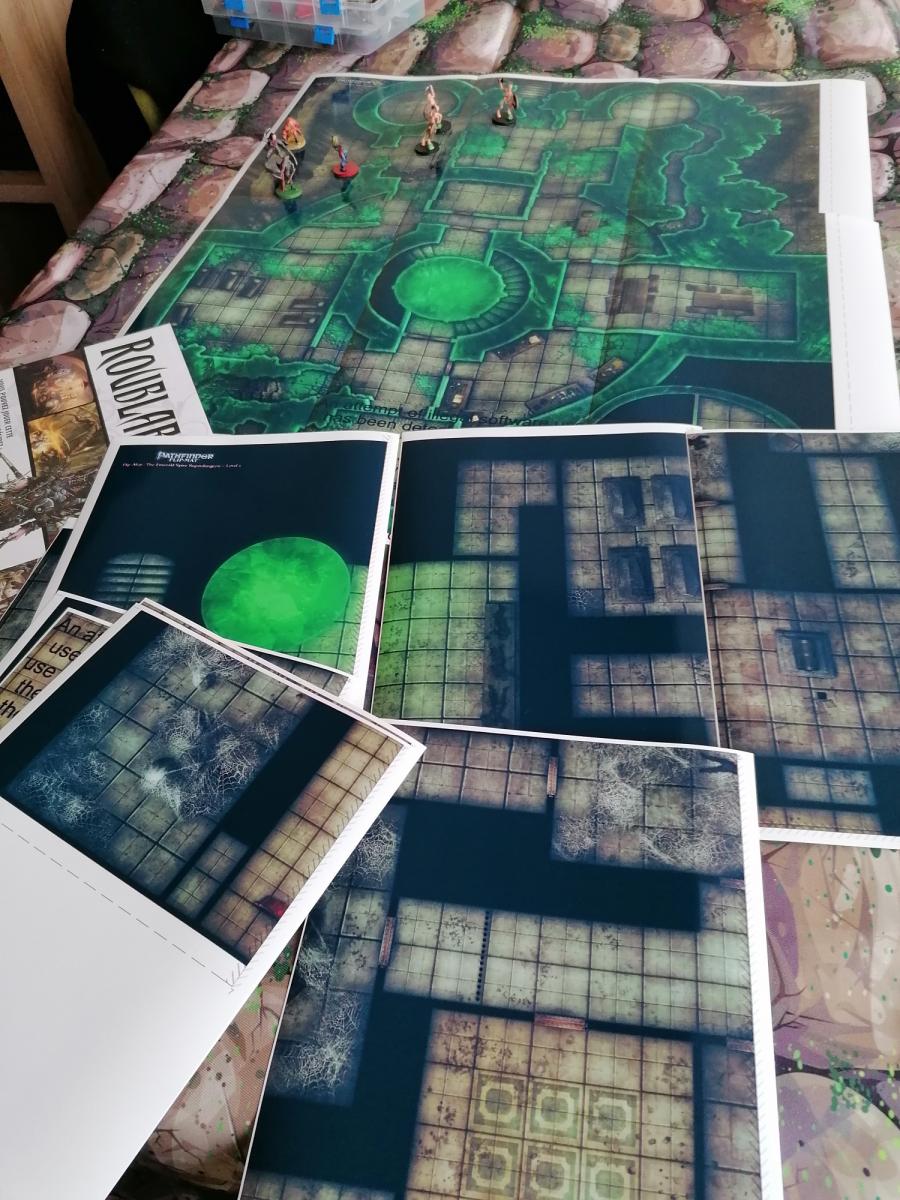 L'inconvénient énorme que je vois avec les plans imprimés ( certes beaux) tirés des bouquins qu'on dispose sur la table ou qu'on projette en vidéo c'est que, outre le prix exhorbitant, ils ne sont pas à l'échelle; en général les cases font 3 x 3 m alors qu'ils devraient faire 1,50 x 1,50 m. Avec des joueurs pointus ça ne peut pas passer pour les combats, les distances, les effets de zone et même l'immersion: on se retrouve avec des pièces trop petites par rapport aux figurines...