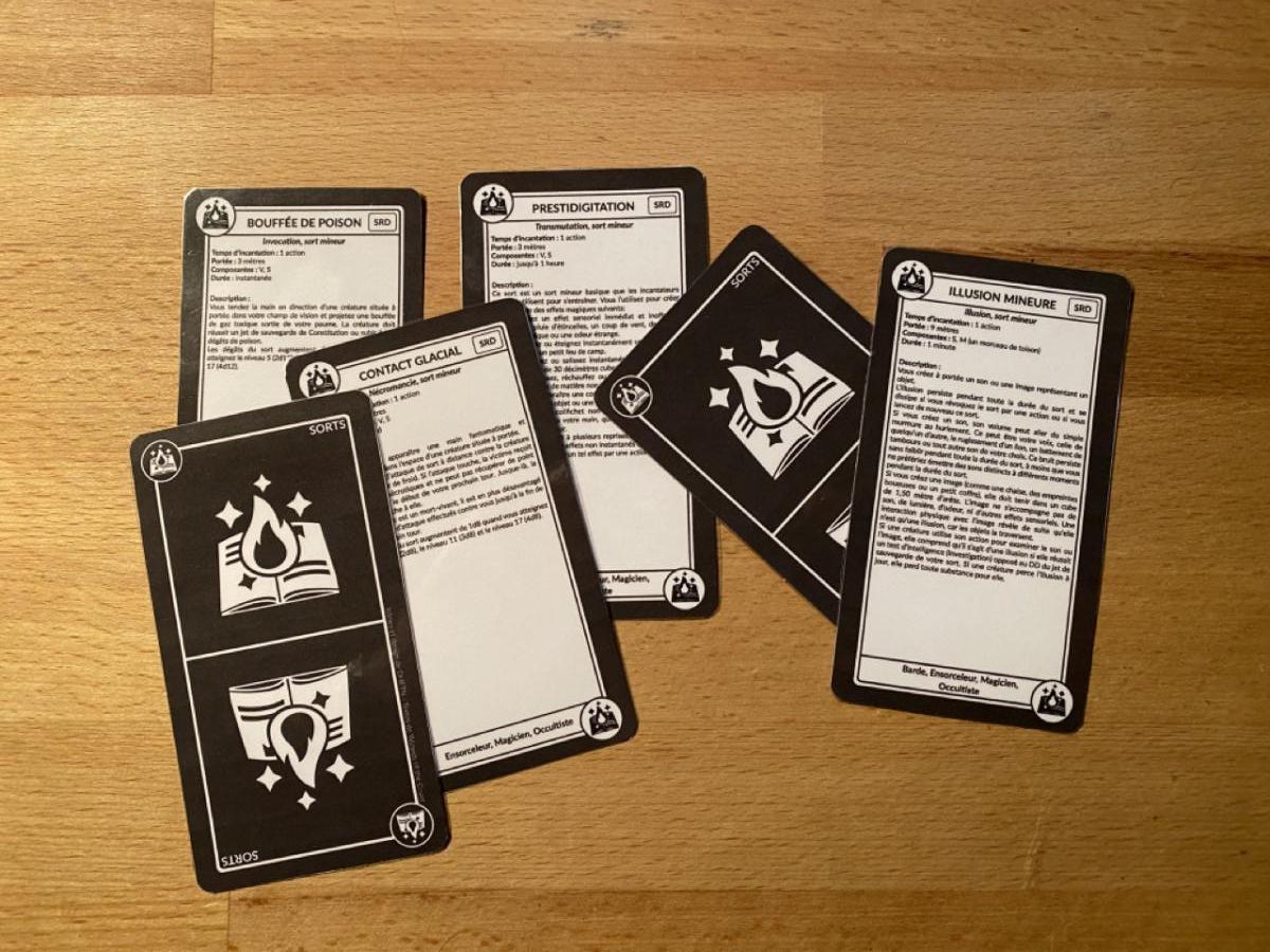 C'est encore mieux qu'avant et la qualité me parait tout à fait satisfaisante pour du jeu amateur. Voici une photo du rendu (vous remarquerez au passage que je m'essaie à un format Tarot pour les cartes de sorts - c'est bien mieux,mais ce n'est pas du tout prêt à être publié) :