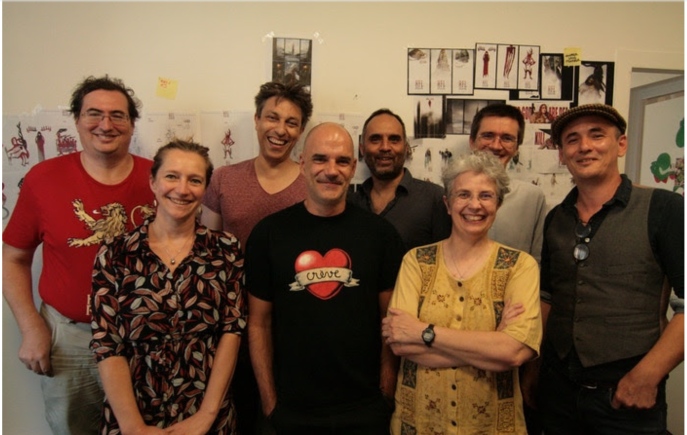Hel of a team ! De gauche à droite : Tristan Lhomme (auteur), Melanyn (autrice), Léonidas, Christophe Madura (Directeur artistique), David Rakoto (Game Designer), Anne Vétillard (Suivi d'écriture et supervision des traductions), Nicolas Pirez (auteur) et Mathieu Gaborit (auteur)