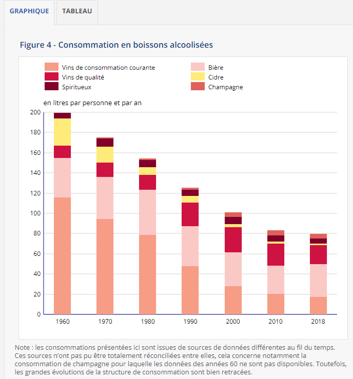 Moi je remarque que le champagne et les vins de qualité s'en sortent pas mal, ce qui peut vouloir dire qu'on boit moins mais mieux. (même si perso, je préfère un bon cidre à n'importe quel champagne)