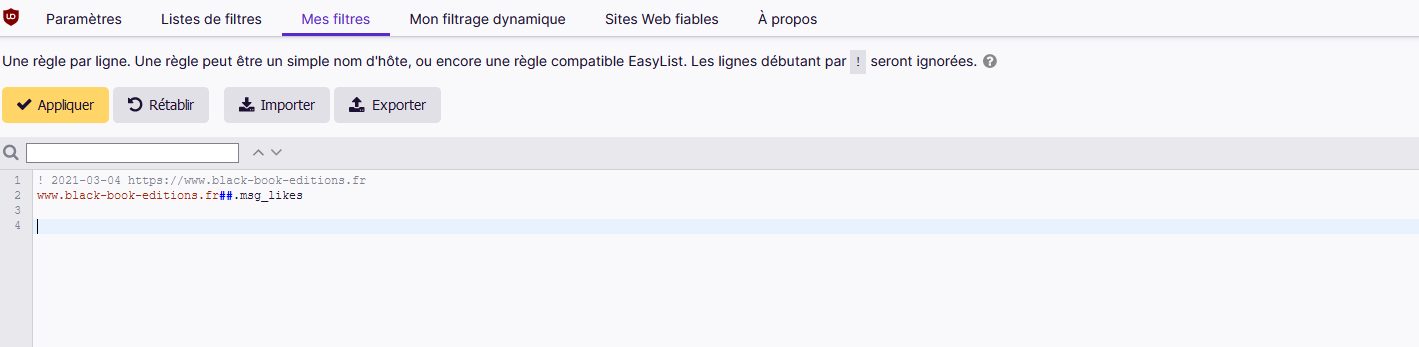 Pour les utilisateurs de uBlock origin (addon de Firefox), voici le tuto :