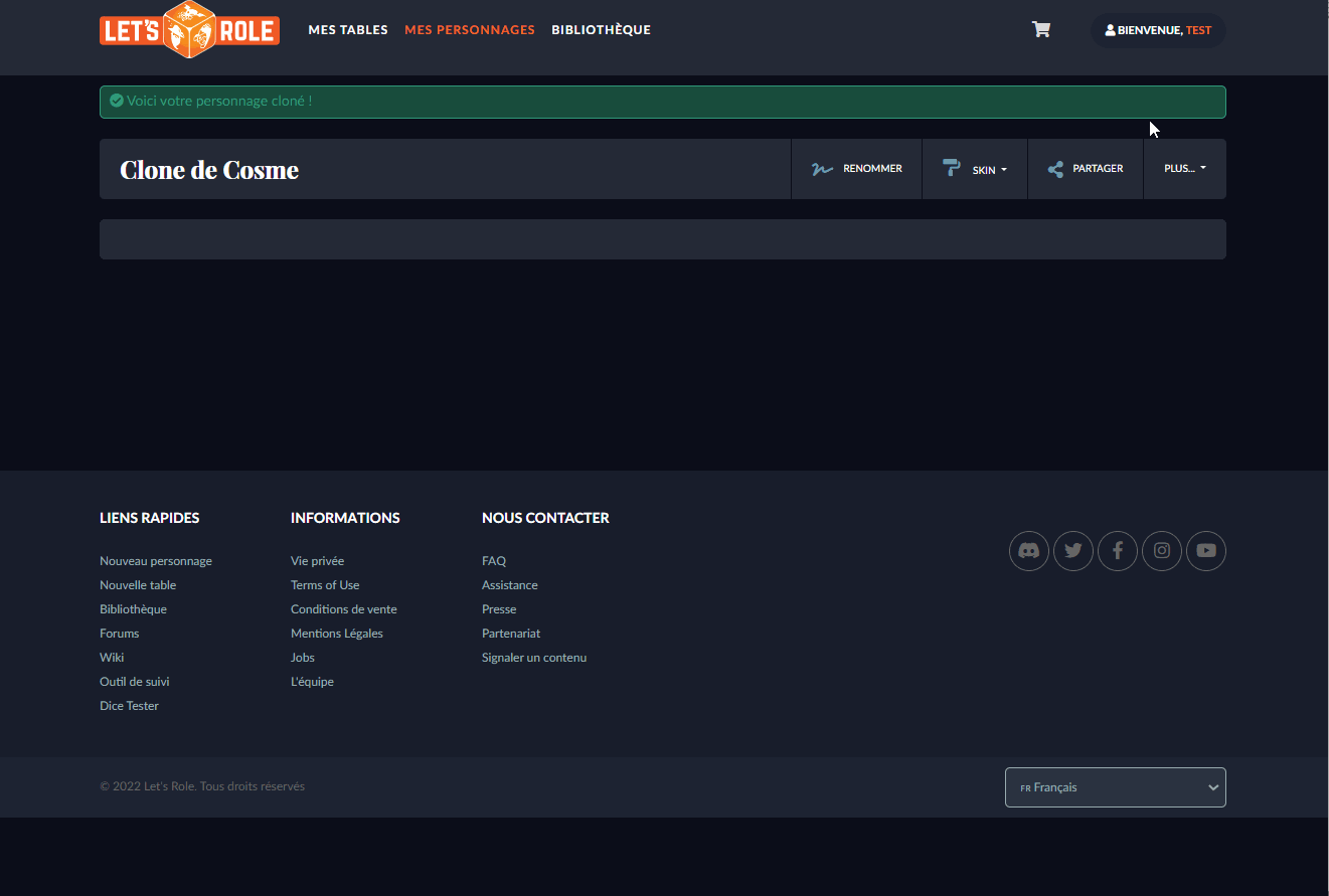 le second c'est la gestion, le fait que les fiches soit créer sur le compte des joueurs et pas sur la partie est assez pénible pour moi, on peut pas ( ou j'arrive pas ) la montrer à un autre joueur ou la passer à quelque si il y a un absent ou à créer des pré tiré pour les filler au joueurs quand la partie commence, sur c'est point sur le discord on m'a conseiller de créer les persos sur mon compte d'envoyer le lien de consultation au autres joueurs et qu'ensuite ils fassent une copie pour rentrer dans la partie avec. c'est quand même assez pénible, cependant dans certain systeme on peut creer une fiche égale à la fiche joueur en lieux et place d'un pnj avec la possibilité de la donner à un joueur un peut comme une aide jeux, mais c'est dépendant du créateur de la partie, ca fait pas parti des fonctionalité garanti de la platforme, c'est qui va vers mon troisieme point.