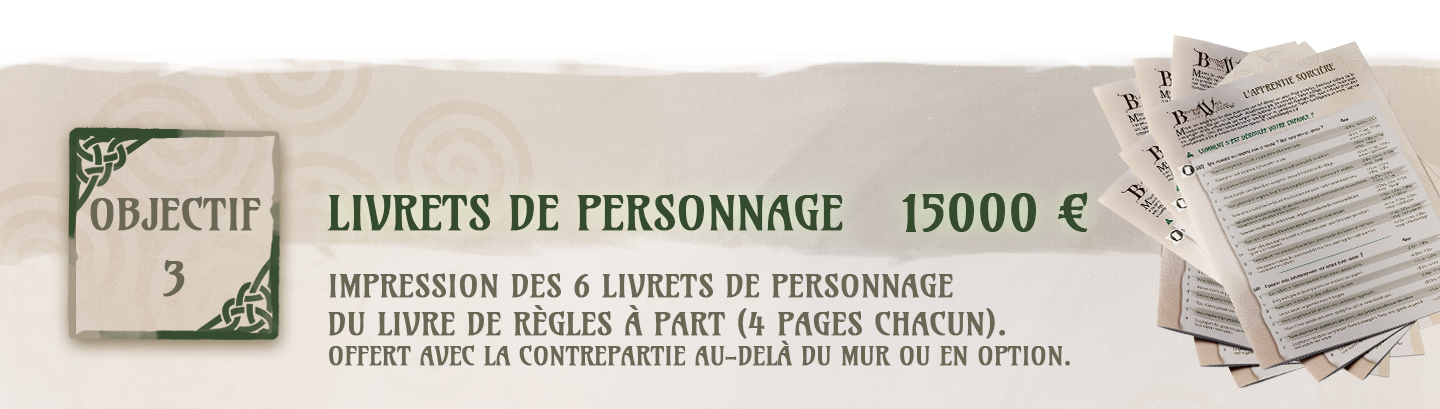 - Nous sommes à moins de 1.000 € de l’objectif permettant l’impression à part des livrets de personnage ! Donc n’hésitez pas à parler de cette précommande dans vos cercles ludiques.