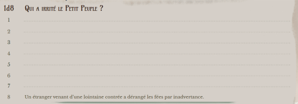 En plus de ces tables, le livret dispose de tables aléatoires pour déterminer un nom de PNJ à la volée (d’inspiration celtique) et une liste d’adversaires potentiels dans laquelle le MJ pourra piocher.