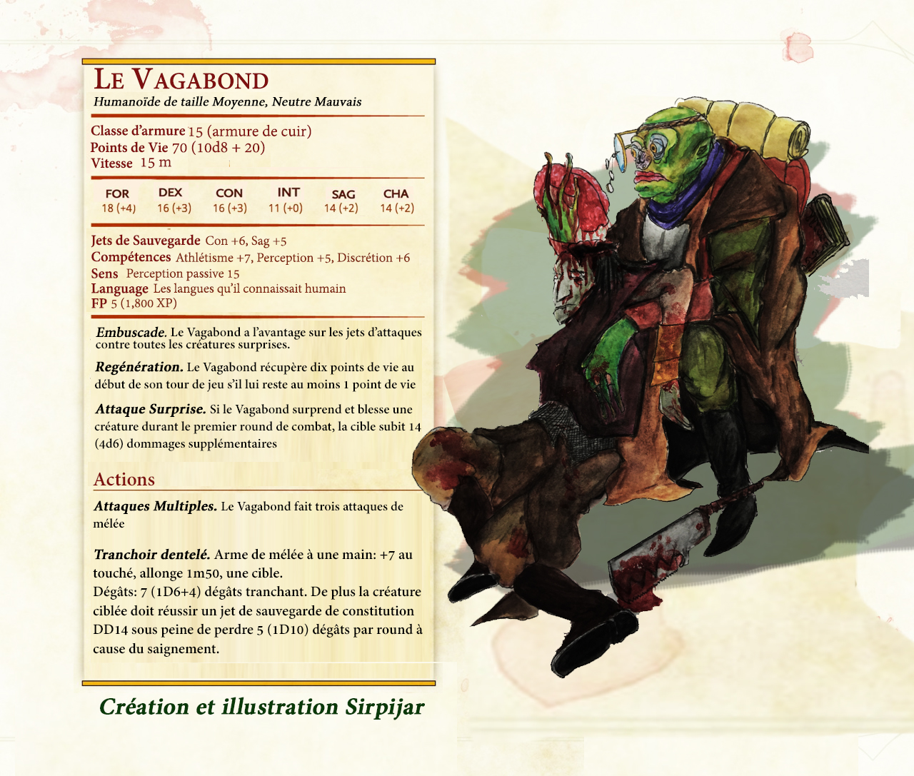 Mais ça n'est pas un adversaire à prendre à la légère, se déplaçant sans bruit dans les ténèbres de la forêts. Pas particulièrement belliqueux, le Vagabond ne reculera devant rien pour "étudier" une nouvelle cervelle humaine...