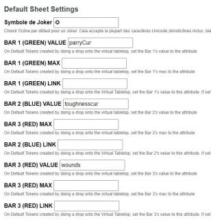 Encore une question... dans la page de paramètrage sur le site de Roll20, on peut attribuer à quelles stats correspondent les marqueurs au-dessus des tokens, définir des trucs plus accessoires comme la couleur du fond par défaut des maps. la capacités de token à voir/produire de la lumière... et in-game, quand je place un token, il est vierge de tout paramètre.