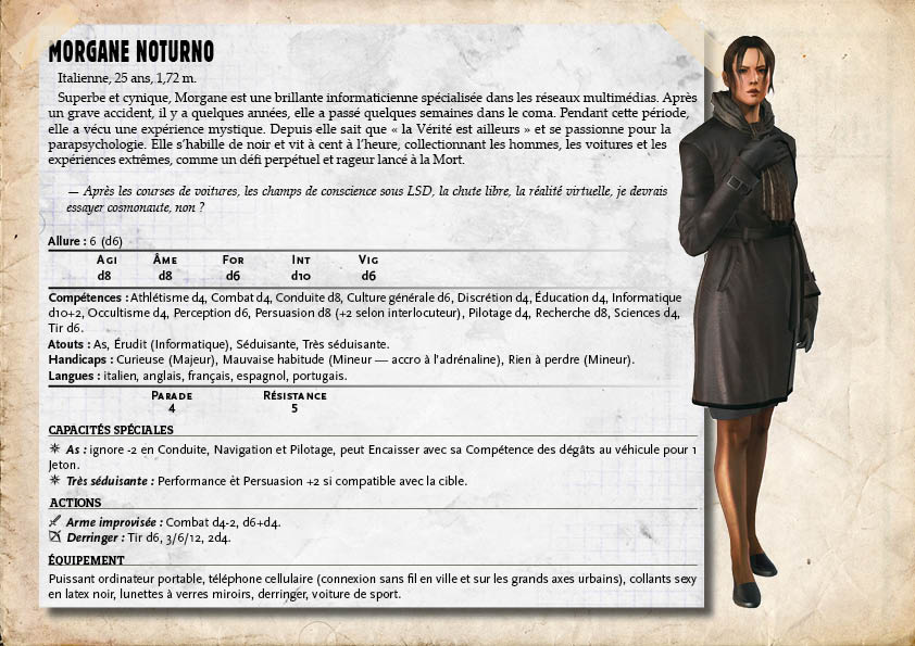 Après les personnages Novices pour des parties de Fantasy ou de Cthulhu, vous trouverez ci-dessous un ensemble de personnages prêts à jouer dans un univers conteporain. Contrairement aux éditions précédentes, ces personnages sont des Vétérans et ont beaucoup plus de pêche comme vous pourrez le constater ci-dessous.