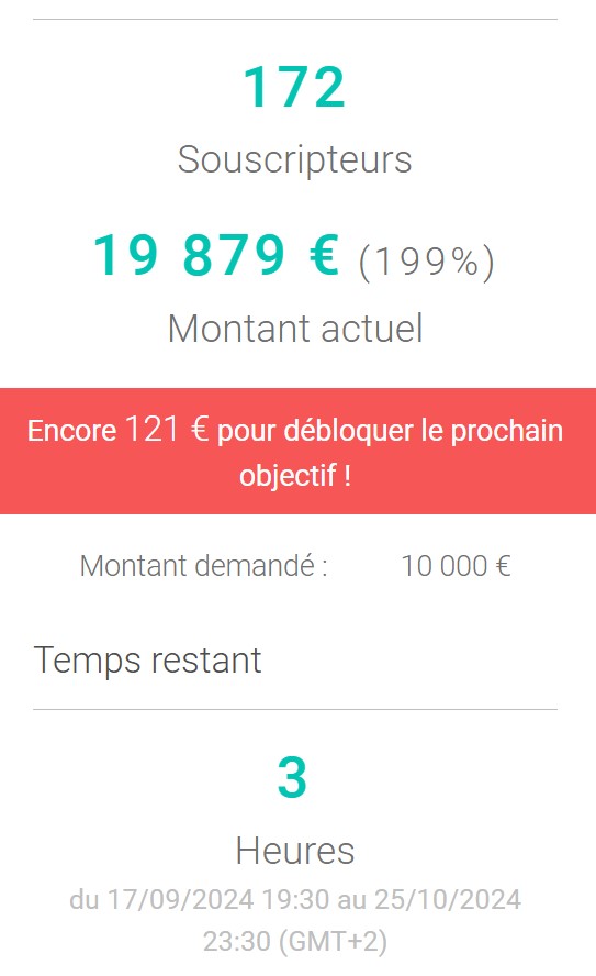 J'ai versé mon écot. Manque 67 € pour débloquer le prochain objectif ! 2 heures encore pour pledger...