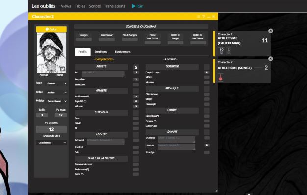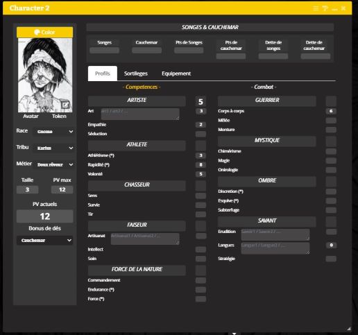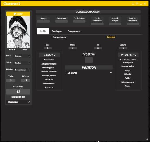 Alors de mon coté j'ai fini une première version jouable qui ne gère pas les primes. Par contre elle gère pas mal de trucs comme le fait de dépenser un dé de songe ou de cauchemar, l'encombrement de l'armure en malus automatique. L'initiative (mais elle n'évolue pas, il faut la changer manuellement)
