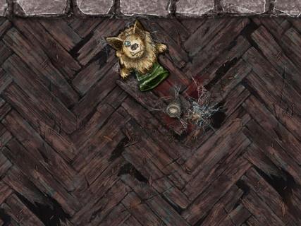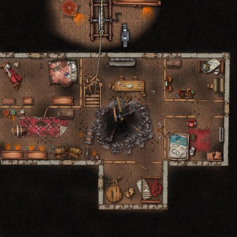 Il s'agit dans mon esprit d'un dessous de lit de géant où le cauchemar est en train de faire naitre une horreur. Elle est dans le cocon et les cadavres de trouvetouts et Nevirine sont des membres de la communauté qui sont parties et ne sont jamais revenus (mes joueurs enquêtent sur leur disparition) Dans mon esprit des chiens du cauchemar vont sortir de la peluche qui est leur nid mais surtout je vais me servir des trous dans le plancher pour faire apparaitre des caraquins durant le combat quand ils seront bien engagés.