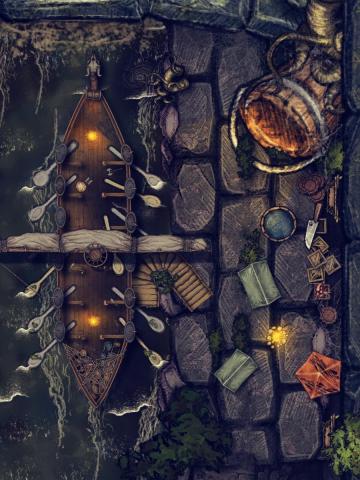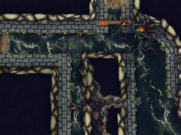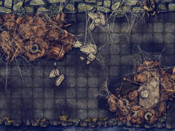 La carte en question vise à les amener à une scène où ils vont devoir soit traverser un pont fortifier soit s'aventurer dans un conduit rempli de toiles d'araignées dans lequel ils finiront par arriver dans un nid de rats. La map est faite bien entendue pour être utilisée avec un brouillard de guerre et dans mon esprit ils arrivent par le bas à droite.