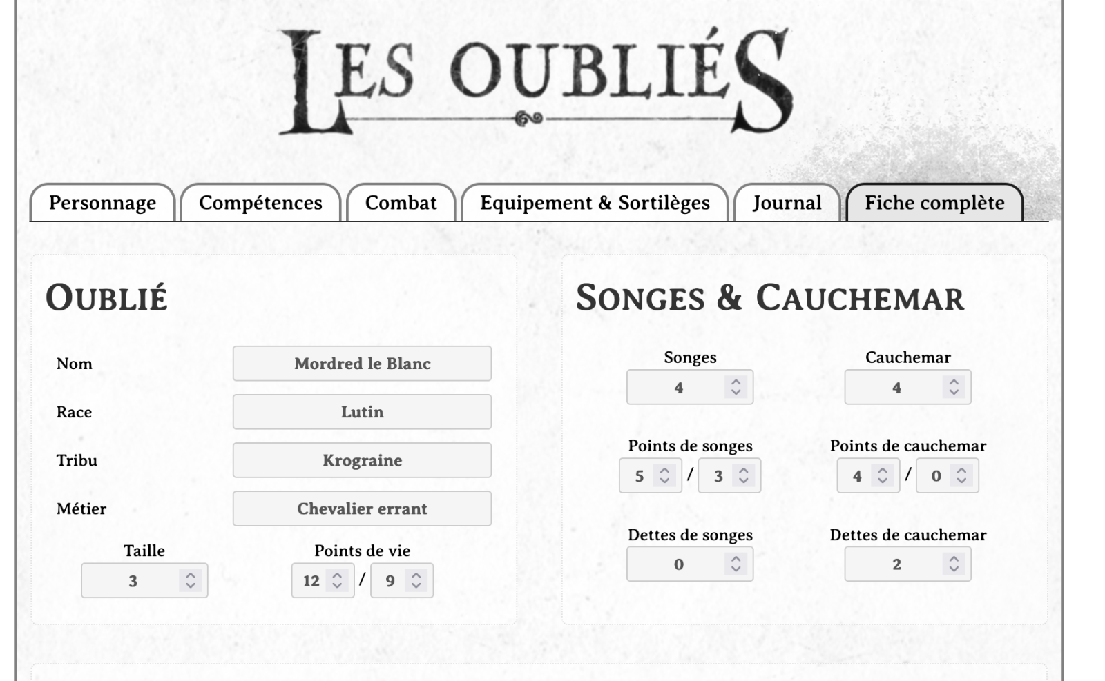 Ci- dessus quelques captures d'écran des fiches perso sur ROLL20, cela tourne très bien.