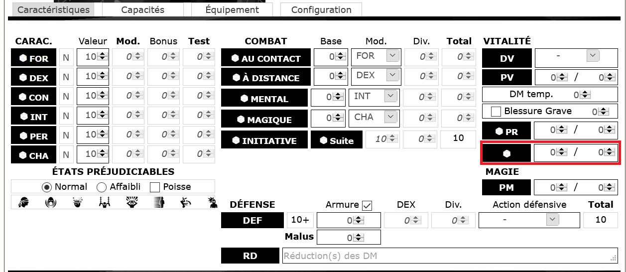 J'avoue que je n'avais pas fait attention aux compteurs autres ressources de l'onglet équipement, mais vu l'importantce des PT, PF et PP (cf plus loin), ce serait quand même nettement plus logique de les intégrer à l'onglet caractéristiques.