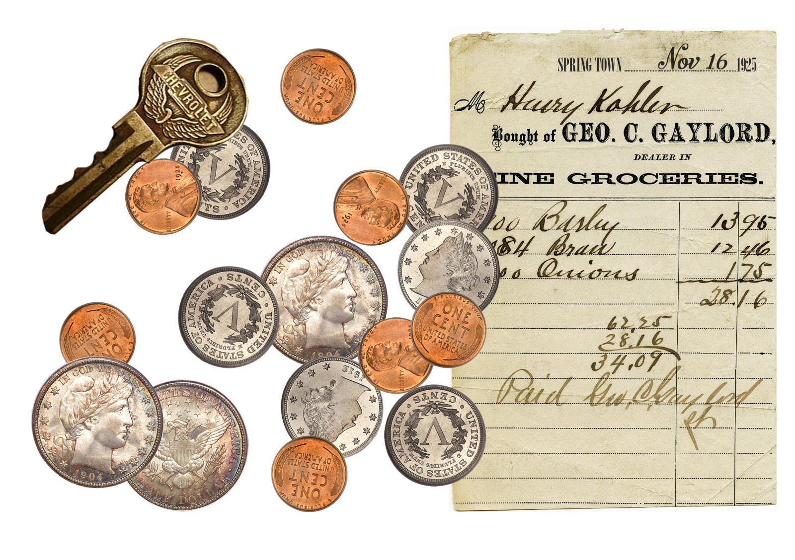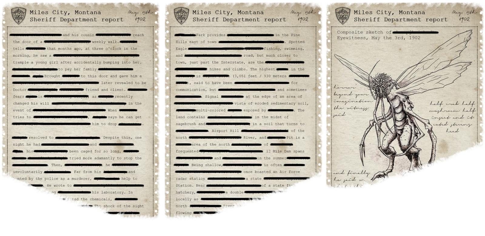 Le contenu des poches du majordome, quelques docuemnts mentionnant une créature étrange, que le personnage qui y a été confronté pourrait avoir récupéré en enquêtant... (un rapport de police caviardé, et un vieil ouvrage - un vrai ? un faux ? signé Newton : peut-être une suite de son fameux ouvrage dans lequel il décrit les lois du mouvement, avec cette fois une description de forces et de créatures et dehors de notre entendement)