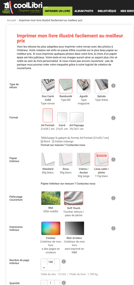 - Pelliculage couverture : Soft Touch (Mat c'est un peu moins cher : 0,29€ ! cela reste donc plus une question de goût)