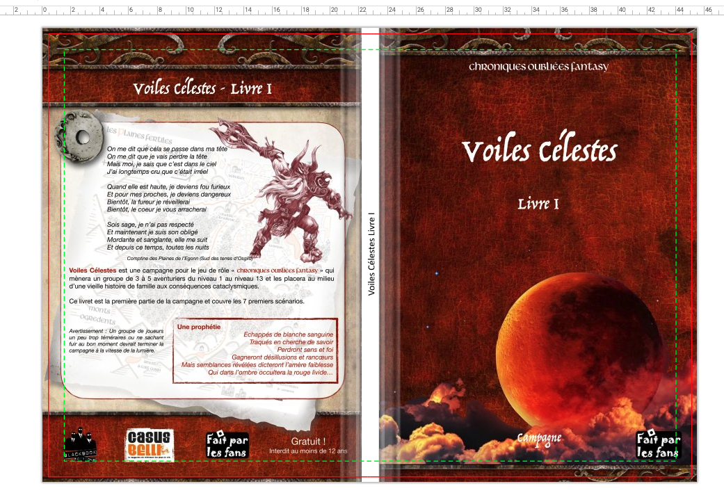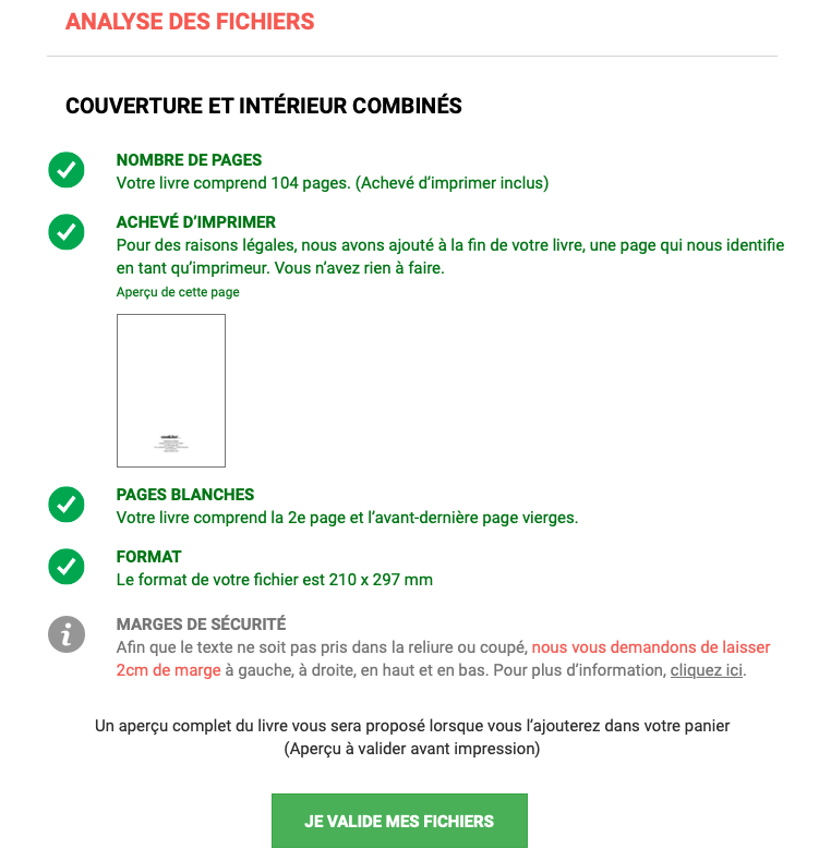 -> Tout sera au vert sauf les marges de sécurité mais cela passe (c'est lié au texte à 1,8cm du bord et non 2cm et des dessins en bords de page). Vous pourrez juger du résultat avant la commande.