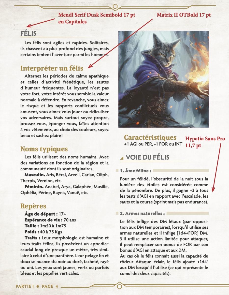 J'ai un peu décortiqué les PDFs que j'avais à dispo pour faire un livret incluant des infos sur les quelques races optionnelles COF1 adaptées en V2 que certains joueurs de ma table souhaittaient jouer pour une nouvelle campagne. La titraille, c'est une typo appelée Mendl Serif avec plusieurs graisses utilisées notamment sur la fiche de perso dont Dusk Bold ou Semibold ou – mais je sais plus où, peut-être sur la fiche de perso – la variante Dawn en versions également regular, bold, semibold etc.