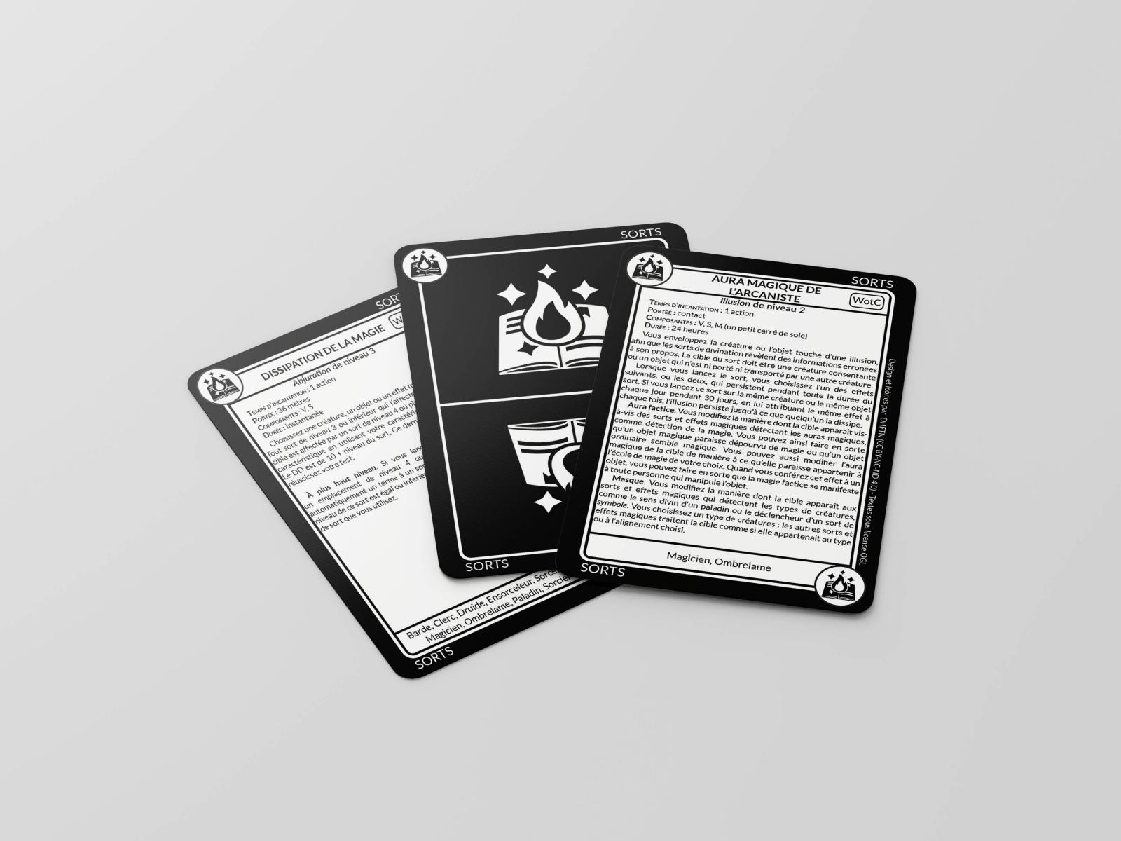 Petit ajout concernant les cartes de sort : j'ai ajouté un deck "Sorts" comportant l'ensemble des sorts - les classes pouvant utiliser chaque sort sont notées en bas de la carte.
