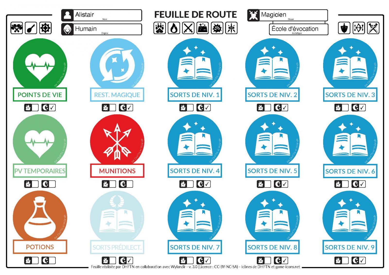 Cette feuille de route entièrement personnalisable avec près de 200 modèles d'emplacement de jetons est idéale pour le suivi des différents consommables et aptitudes de votre personnage... Si vous avez l'habitude de jouer avec des jetons de poker pour comptabiliser vos PV, vos munitions, vos emplacements de sorts ou vos aptitudes nécessitant un repos, alors cette feuille de route est faite pour vous. Nouveauté de la version 3 : une case à cocher pour préciser le type de repos nécessaire !