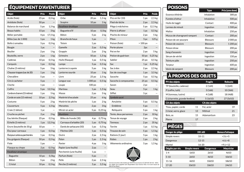 - Un insert comportant la liste des différents objets et outils à disposition des joueurs ainsi que les principaux poisons et les règles de base concernant les pièges ;