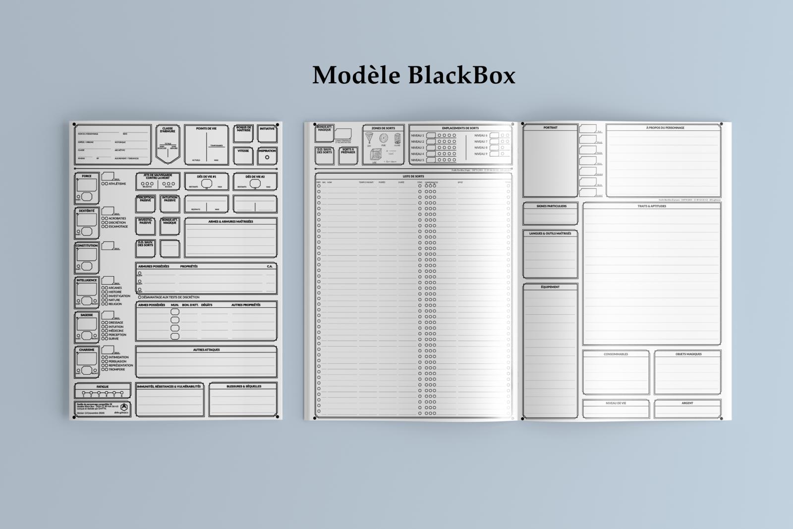 Une nouvelle mouture pour les fiches de personnage, cette fois dans une version BlackBox. Vous retrouverez les principales fonctions des modèles précédents dans une version épurée et réagencée tout en noir et blanc et arborant un design faisant davantage référence aux grandes éditions de jeux de rôle.