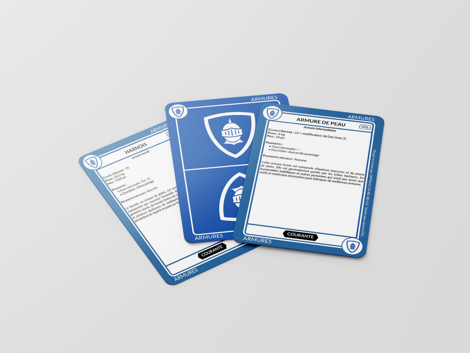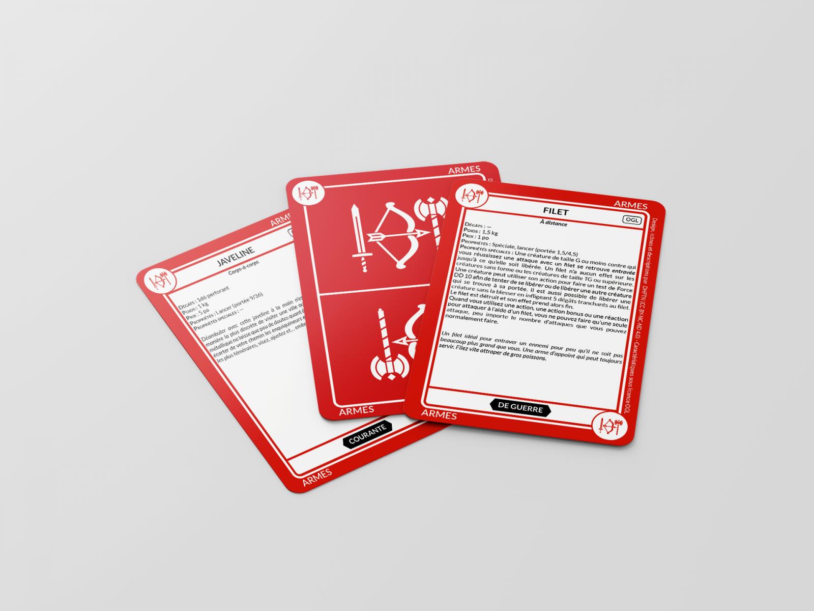 Un deck comprenant les armes et armures de base ainsi que leur principales caractéristiques. Ces cartes comportent les caractéristiques principales des différentes armes les plus courantes : prix, dégâts, propriétés, etc.