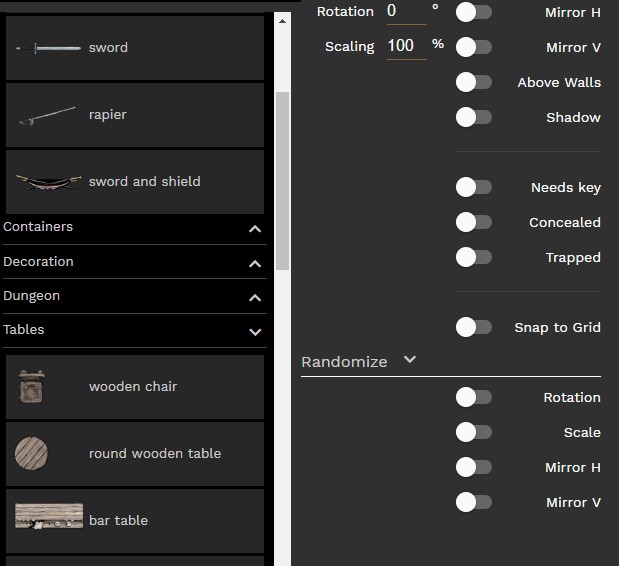 Et enfin, et surtout, les options de randomisation, pour modifier aléatoirement les objets si vous posez plusieurs fois le même. Très utile quand on a pleins de chaise à poser, ou des toiles d'araignées, plusieurs tonneaux, des arbres, etc. Vous pouvez donner une fourchette haute et une fourchette basse pour la rotation et le changement d'échelle.