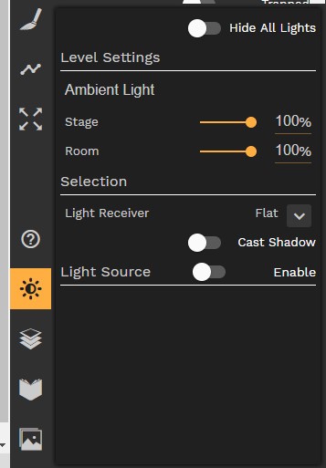 En sélectionnant l'un des objets que l'on veut voir soit en source de lumière, soit en source d'ombre, et en allant dans l'outil luminosité (Lighting), un monde nouveau s'ouvre à nous.
