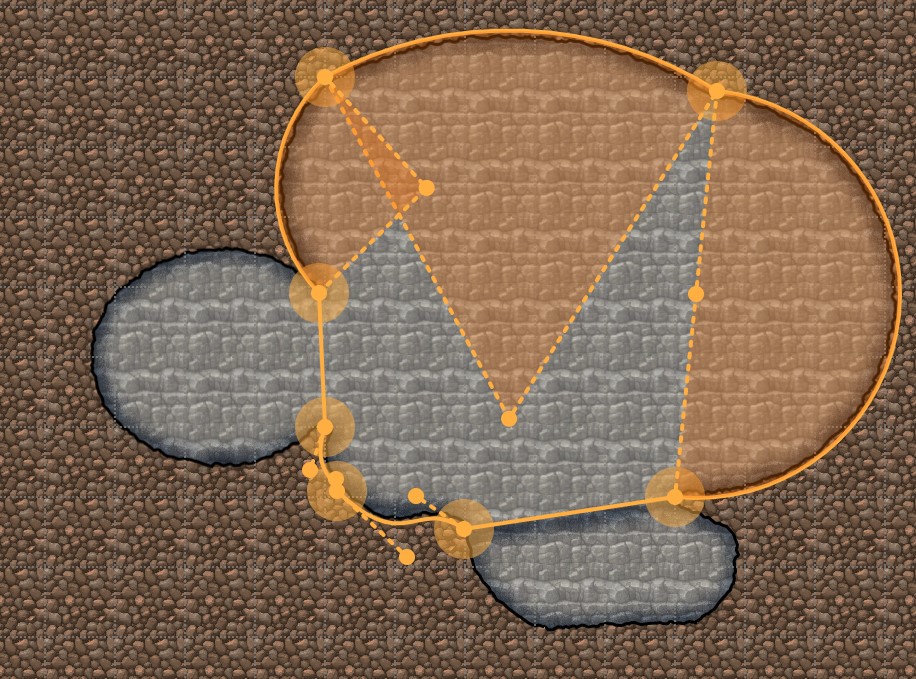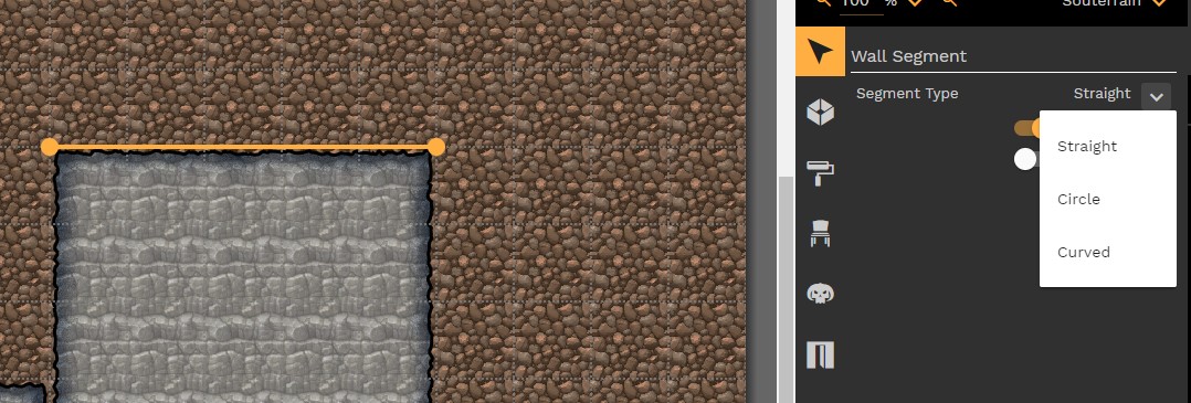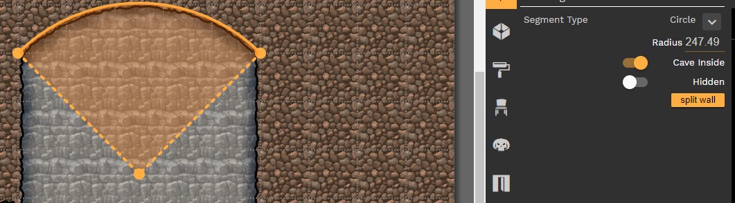 En courbant les murs un par un, en utilisant les points présents sur le mur, le point "central", les options pour dissimuler certains murs (hidden), pour les découper (split wall), et en oubliant pas la touche shift pour ne plus "coller" aux cases, on va modifier gentiment notre carte pour obtenir une vrai cave.