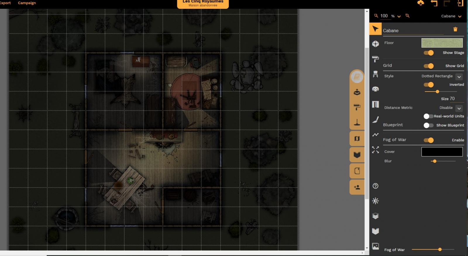 Voilà, avec ça j'ai à peu près fait le tour des fonctions de base d'édition de Dungeonfog. Sachant que je n'ai pas évoqué certains outils pour faire des formes directement à même le sol, sans mur (comme pour faire un point d'eau, ou un motif), les notes de MJ, les tokens, mais ça donne déjà une bonne base.
