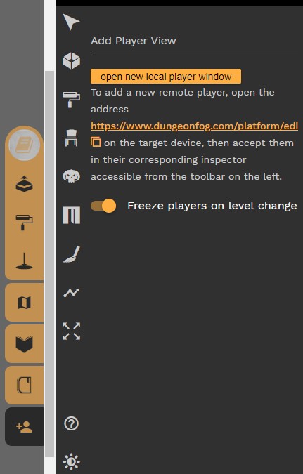 Les outils en jaune, vers la droite, sont vos outils de MJ. En partant du haut le premier sert à mettre/retirer le brouillard de guerre dans toute une pièce, le second à mettre/retirer le brouillard de guerre avec un pinceau, le troisième à pinguer, le quatrième permet de charger une autre carte de la campagne, le cinquième ce sont vos notes, le sixième votre journal, et enfin le dernier, celui qui va nous intéresser, sert à rajouter des joueurs.