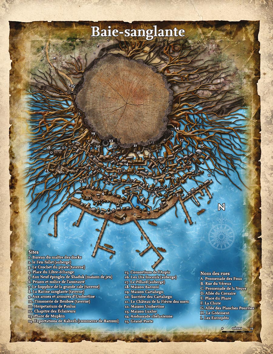 Baie-sanglante est à la fois un refuge de pirates et un port commercial libre. La ville a été fondée par de grands capitaines des Chaînes qui, devenus trop vieux pour la piraterie, ont compris que, au crépuscule de leur vie, le commerce légitime était le meilleur moyen de s’enrichir. Depuis, Baie-sanglante est devenu un terrain neutre. Les passerelles élevées grouillent d’équipages pirates comme de marins venus à bord des navires marchands de tous horizons. Chaque nuit voit son lot de bagarres et de coups de couteaux mais on n’assiste jamais à de véritables guerres des gangs. Tant que les bateaux et leur cargaison restent au port, ils sont généralement à l’abri des pirates. Mais une fois qu’ils reprennent la mer, ils perdent la protection dont ils bénéficiaient à Baie-sanglante.