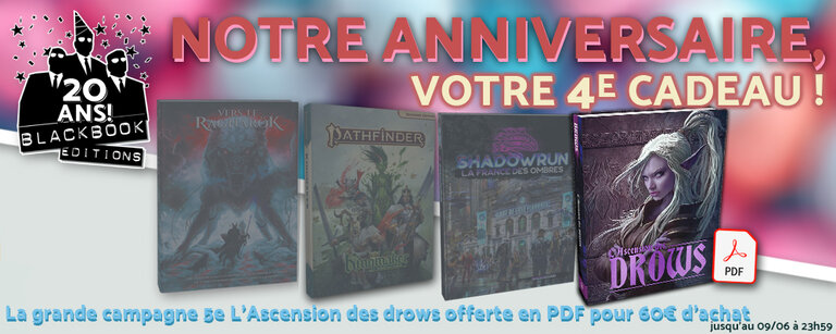 Mais ce n'est pas tout : pendant une semaine, jusqu'au dimanche 09/06 à 23h59, nous vous offrons la version numérique de la massive campagne et setting 5E L'Ascension des drows pour Shadowrun (6e édition & Anarchy) dès 60 euros d'achats (produits physiques et numériques confondus).