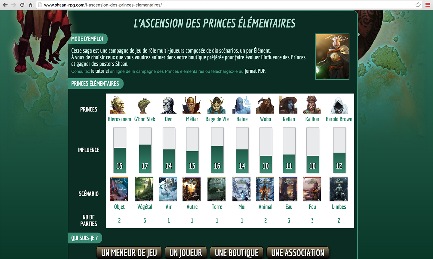 Chacun des dix scénarios proposés permet de rivaliser avec l’un de ces dix Princes et, selon la réussite de chaque groupe de jeu, d’augmenter ou de réduire son influence sur le monde de Shaan. Le résultat des scénarios sont en effet enregistrés sur le site de Shaan pour permettre de visualiser "en temps réel" l'évolution de l’influence des Princes (voir l'image ci-contre).