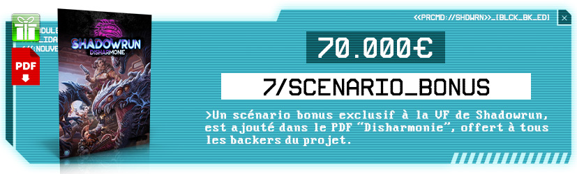 Foncez précommander les suppléments Shadowrun et faites monter la cagnotte pour débloquer les prochains cadeaux ! En participant à la précommande, vous bénéficiez évidemment des PDF des ouvrages offerts et de tarifs réduits sur certains ouvrages.