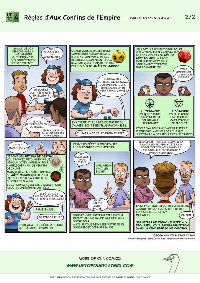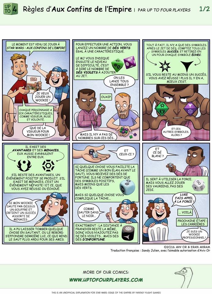 Le webzine BD sur le jeu et les joueurs uptofourplayers.com a posté il y a peu deux pages d'une BD présentant la mécanique de jeu de base du jeu de rôle Star Wars - Au confins de l'Empire (publié par Edge Entertainement en France, sous licence FFG). Mais en anglais évidemment !